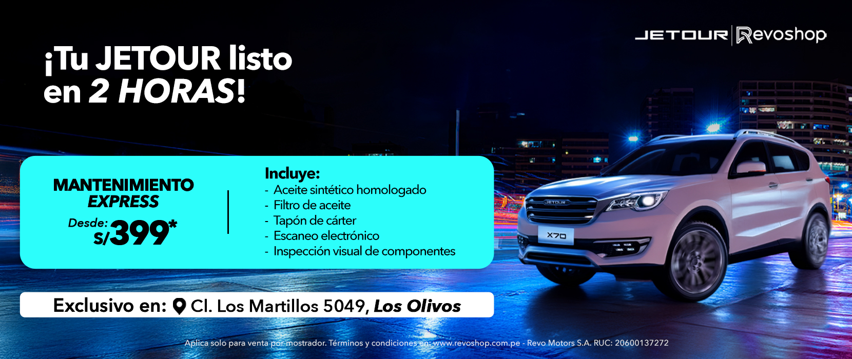 Promoción exclusiva de Revo Motors S.A. (RUC: 20600137272) y Terpel Comercial del Perú (RUC: 20259880603). Campaña válida del 3 al 31 de enero de 2026. Promoción válida en la red de talleres Revoshop Jetour (Surquillo y Los Olivos). La campaña es válida para todos los clientes que realicen su servicio preventivo en uno de nuestros talleres y que realicen un consumo mínimo de S/650. No válido para clientes que solo realicen servicios correctivos. El beneficio se hará efectivo previa coordinación con el cliente en la fecha indicada por Revo Motors y Terpel Comercial del Perú. De no poder recibir el beneficio el día y horario establecido, Revo Motors S.A. y Terpel Comercial del Perú se reservan el derecho de modificar la entrega del beneficio. Al participar de esta campaña, el cliente acepta el tratamiento de sus datos personales, así como el derecho de su imagen para fines publicitarios. Campaña no acumulable con otras promociones. Sujeto a disponibilidad del taller y previa cita. Para mayor información, contacte al 01 618-5075 o al 982 447 866.
